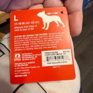 This is a new with tags Star Wars Chewbacca jumpsuit with attached hoodie. It is sized as a Large for dogs measuring 17-19" from neck to tail(I wouldnt go with a dog that is too tall...as it will probably fit...but for it to looks like a properly fitted jumpsuit, maybe a dog that is shorter/stockier...but thats your call. I do have more costumes listed (new and used) in different sizes. #dogstarwarscostume #dogchewbaccacostume #dogstarwarsclothing #doghalloweencostume #largedoghalloweencostume