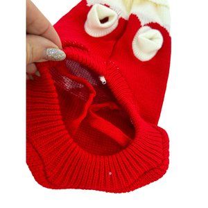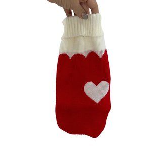 0942A- Dog Sweater for small & medium-sized dogs. Red & Cream, with Ivory Heart on Red background, scalloped design, 2” ribbed turtleneck, Stretchy, acrylic, 13.5” long, 8.5” around neck opening, stretches to 13” around. 14” around middle, 14” opening for back legs. .5” back leg loops. 6” around front leg opening. Made in China. New without tags.