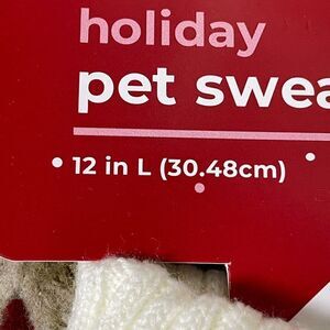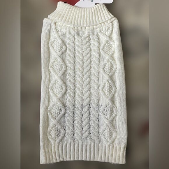 This is described as a “Holiday” pet sweater, but I think it’s a sweater for all year long! It’s a beautiful white cable knit sweater with a ribbed turtleneck. Your pet will love it, and you will too!