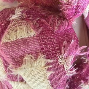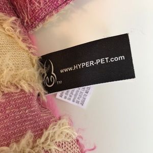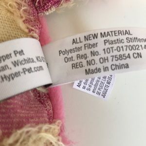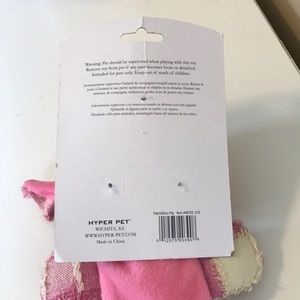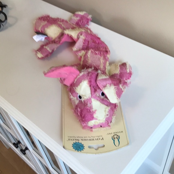 Dog toy with squeakers. Patchwork distressed fabric. Polyester. Three squeakers. Pink and ivory.