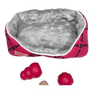 • Pink and Gray Pet Bed: Soft, plush interior with paw-print design on the outside.