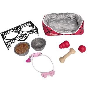 Battat OG For American Girl Pet Dog 1 Reversible Pet Bed 1 Bone 1 Pink Bow Collar 2 Food Water Bowls 1 Food Bowl Stand 1 Kong Toy 1 Ball Toy