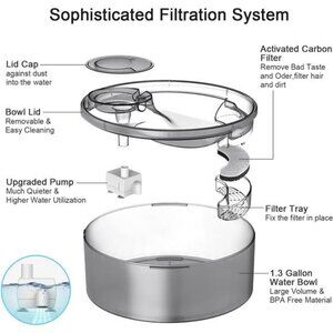 🧿Triple-filtration System: 3 layers filter: Sponge could catch cats hair and debris, the ion exchange resin layer could soften the tap water, the third activated carbon layer could remove bad taste and odor that provides fresh and clean water to pets.