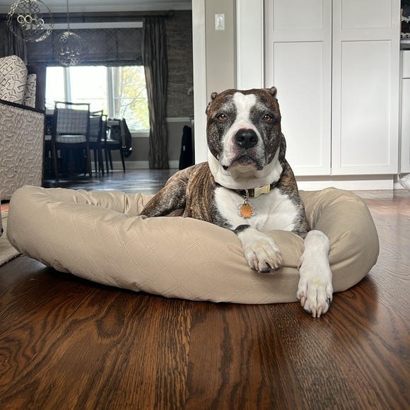 Taupe-brown durable dog bed. 100% polyester filled for a medium sized dog.