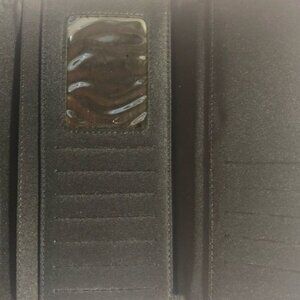 This stylish black wallet is embellished with intricate designs, featuring a convenient snap closure and a separate checkbook section. Perfect for women who appreciate both fashion and functionality.