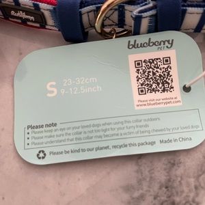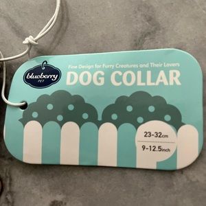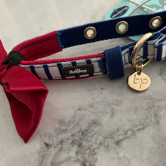 Red satin-y bow tie dog collar with blue and white stripes. Gold clasps. Size small new unworn. This was too big for my dog