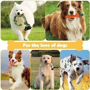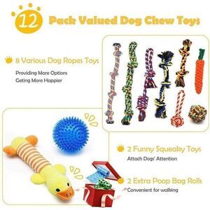 -Super Luxury Small to Medium Dog Toys: There are 12 pack, contain 8 various types of knots rope toys for aggressive chewers, 2 squeaky dog toys and 2 extra poop bag rolls as a gift. Now paying less to get more toys than others. More dog toys give the dog more playtime, more fun.