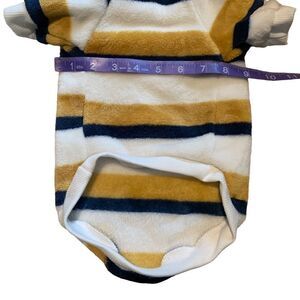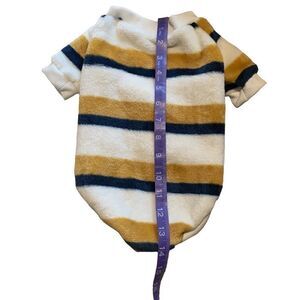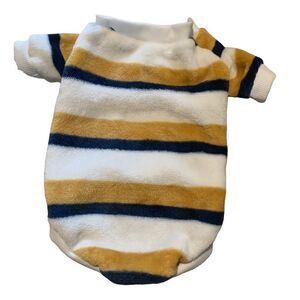 Cute blue white & mustard yellow striped dog sweater. Plush cozy polyester fabric. No brand tag. Size is a large but I would say large for a smaller pup. Please see measurements in photos. In excellent condition. No tags but never worn. Size large.