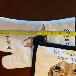 This festive oven mitt and pot holder set feature charming dog illustrations, perfect for adding a playful touch to your kitchen during the holiday season.