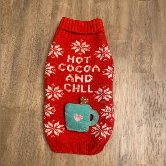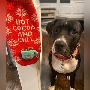 Hot Cocoa and Chill doggie sweater, for a dog about 20-30lbs. In perfect condition, my guy just outgrew it!