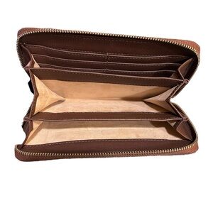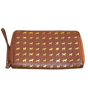 Doghaus brand brown wristlet wallet with gold silhouettes of various dogs on the outside. Zip closure with three super soft interior compartments and slots for credit cards. Perfect for dog lovers!