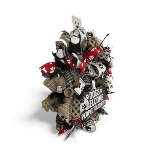 This wreath is hand crafted with quality black & tan deco mesh, wired ribbon in coordinating colors with a dog bone and dog paw accent, and a 15" wooden sign. The wreath measures approximately 24” in diameter and 6” deep.