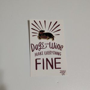 A high-quality hard enamel "Dogs & Wine" pin with dog and wine bottle design and butterfly clip closure. Comes packaged on a double-sided, thoughtfully-coordinated "Dogs And Wine Make Everything Fine" card with a blank reverse side for a handwritten note.