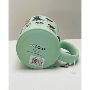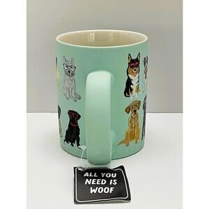 Brand new, Dogs in Glasses, "All You Need Is Woof" Gifts by Eccolo, 16oz Soft Touch Mug. Very cute mug features many breeds of dogs all wearing glasses. Mug is a beautiful shade of light mint green, has a matte finish and very smooth to touch due to reactive glaze. Measures 4 1/4" in height, 3 1/2" across, and 3 1/4" handle. Comes with a cute gift tag "All You Need Is Woof". Not for use in the microwave, hand wash only. Comes from a smoke free, pet free home.
