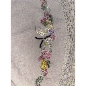 Beautiful, handmade, off-white, ivory, round circular tablecloth, home decor, easter spring pastel doily with crochet and embroidery of floral basket , Butterflies. Perfect for Easter spring March *** flaw: A few faint stains on crochet part. Please see pictures 25 inches across diameter Movie prop play