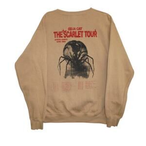 Official Doja Cat "The Scarlet Tour" crewneck sweatshirt featuring bold red gothic-style lettering, a spider graphic on the front, and full tour dates printed on the back. Beige/tan colorway with ribbed cuffs, neckline, and hem. Made from a soft cotton-poly blend for comfort and durability. Size Large. Pre-owned in great condition with no major flaws, perfect for fans and collectors of Doja Cat merchandise.