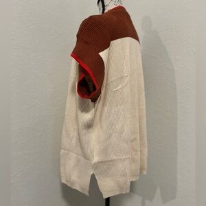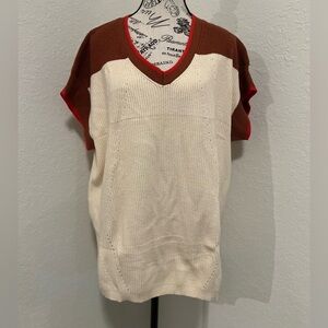 Stay stylish with this chic colorblock V-neck sweater. Featuring a blend of cream, brown, and red, this piece is perfect for any occasion.