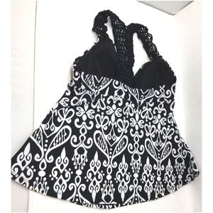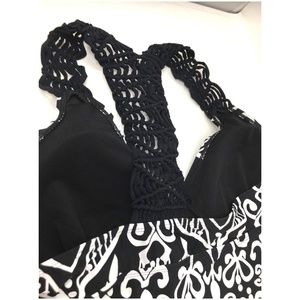 Babydoll style top has a deep V neckline front, gathered padded cups and woven straps