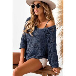 Dokotoo Women's Spring Summer 3/4 Sleeve Navy Blue Off Shoulder Sweater