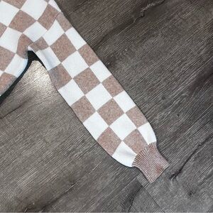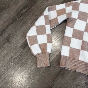 Stay stylish and cozy with this checkered tan and white sweater. Perfect for any casual outing.
