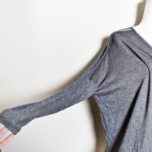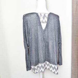 Dolan from Anthropologie oversized gray blouse with a deep v neck, long sleeves, cold shoulder detail and keyhole back. Gray and white sequin trim.