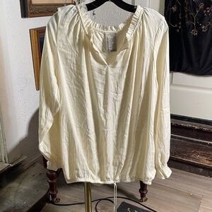Effortlessly romantic and easy to style, this Dolan Left Coast Collection blouse (sold through Anthropologie) features a soft cream tone with a relaxed silhouette. Designed with a gathered neckline, adjustable drawstring hem, and subtle ruffle cuffs for a feminine finish.