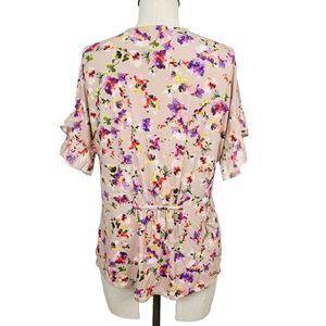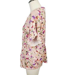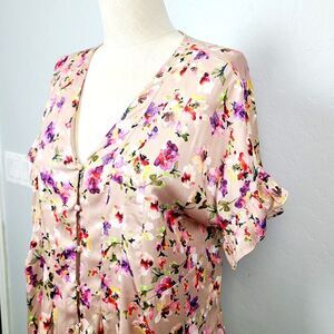 Dolan Anthropologie Top M Pink Multi Floral Silky Ruffle Sleeve Buttoned Blouse
