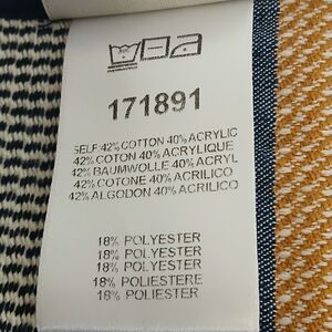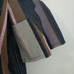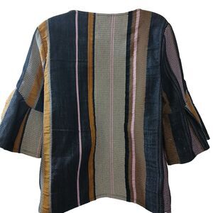 The Dolan Anthropologie Women's Left Coast Collection Luella Stripe Jacquard in size M is a stylish blouse perfect for casual occasions. Featuring a round neck, 3/4 bell sleeves, and a pullover closure, this top is made of a blend of polyester, cotton, and acrylic. With a colorful multicolor striped pattern, this blouse is machine washable and has a regular fit. Ideal for the summer and spring seasons, this basic top from Dolan is a versatile addition to any woman's wardrobe.