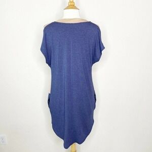 Great go to dress by Dolan.Color-blocked pattern in shades of tan and navy.Two front pockets.V-neck with pleats at V- point. Slight high low hem.Wear as a dress or tunic with leggings.Super versatile and easy!All measurements are approximate and taken flat.