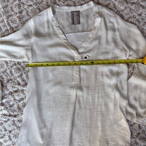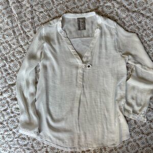 This chic cream blouse by Dolan Anthropologie showcases a refined V neck collar and a buttoned front, crafted from a soft, flowy fabric. Its classic design and elegant style make it a versatile piece for any wardrobe.