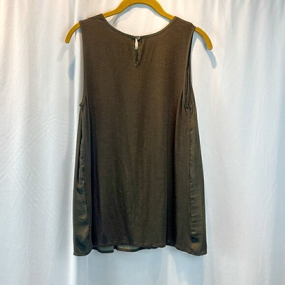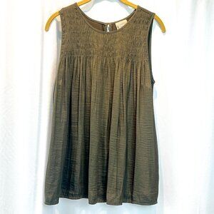 For sale is Anthropologie partner Dolan Left Coast smocked sleeveless blouse in a very dark khaki color. The khaki shade is perfect color to transition to fall fashions while still staying cool with the sleeveless tank. The smocked detail in the front is sweet while the flowy fabric and style makes this top super feminine. Jersey feel in the back with keyhole closure at the neck.