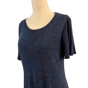 Effortlessly chic Dolan Left Coast Collection dress in a heathered blue knit fabric. Features short ruffle sleeves, a flattering scoop neckline, and a flowing handkerchief hemline. Fully lined for comfort and coverage.