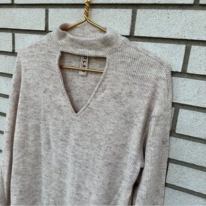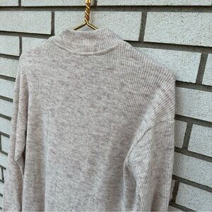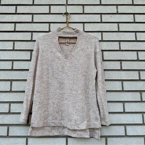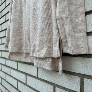 Ribbed soft stretchy fabric. Has a v cut out at chest. Mock neck look. Side split hem. Slight high low style. Oatmeal cream color. Size XS. Excellent used condition.