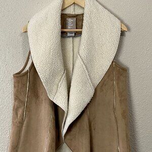 Dolan Left Coast vest with pockets, faux sherpa lining and a hook closure. Super soft inside and out. Waterfall front. Please see pictures for more details and measurements. Small spot on the inside of the vest as seen in the last picture. Looks like it is part of the fabric not a stain. Otherwise perfect condition.