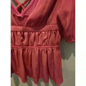 Keywords: women's blouse, pink blouse, sleeveless top, V-neck, smocked waist, peplum hem, casual wear, spring fashion, Dolan Left Coast Collection, tie-back detail, high-quality fabric, solid pattern, regular fit, XS size, new with tags.