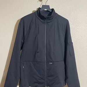 Stylish black zip-up jacket. Long sleeves. Perfect for casual wear.