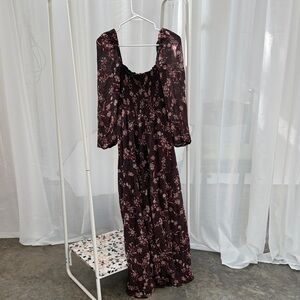 Super pretty burgundy floral maxi dress with a shirred top, adjustable sleeves and tiered skirt. The pattern has a subtle polka dot behind it. Measurements pictured but know that there is a ton of stretch in the shirred bodice. Perfect for fall! Reminds me of Doen. Tag has come off but brand is Dolan.