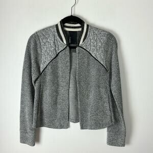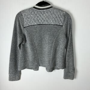 Gently Used Dolan Anthropologie Sweater. This is a women's small. Multiple shade of gray throughout. Varsity jacket look to the neckline. Kind of like an open bomber jacket but a sweater. Definitely unique! Soft and cozy! Front pockets. 80% rayon, 20% polyester.