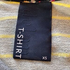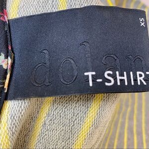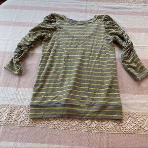 Dolan T-Shirt Anthropology Striped W/Ruched Sleeves. Gray with yellow stripes. Gently used condition. Size XS. Measures chest 33”, length 24”, sleeve 17”.