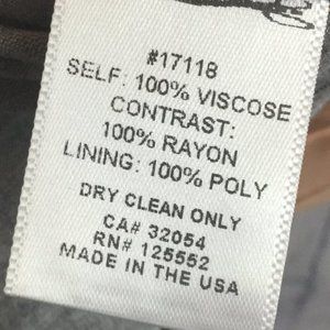 Excellent pre-owned condition. 100% Rayon on front 100% poly on back.