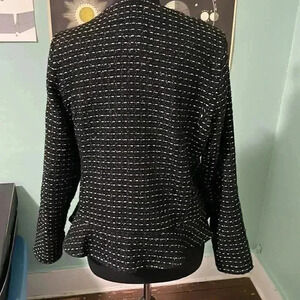 This jacket is an excellent used condition. It is meant to be worn open like a cardigan and has no buttons. The woven texture has a nice bit of sparkle to it. Just is 40 inches. The length is 24 inches.