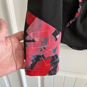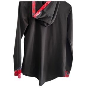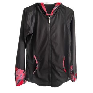 Black curved hem hooded jacket with mesh see thru sides and abstract pink pops of color,