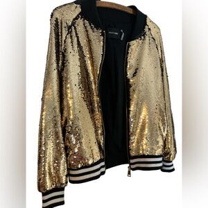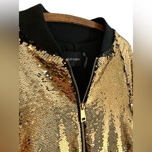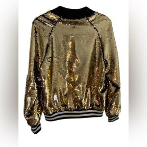 This jacket OMG!!! Absolutely gorgeous gold sequin Dolce Cabo bomber jacket. Ribbed elastic cuffs and waistband. No flaws that I can find. This beautiful piece spackles like a million stars. Generous fit for an XS, could fit a small or maybe even medium. Lined. Pockets. Smooth heavy gold zipper.
