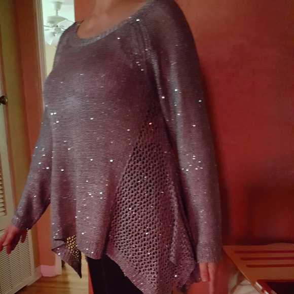 Beautiful top, longer length at the sides covers the hips. Excellent condition, versatile and comfortable - can be worn with wide-leg pants as evening attire, or leggings/jeans with heels!