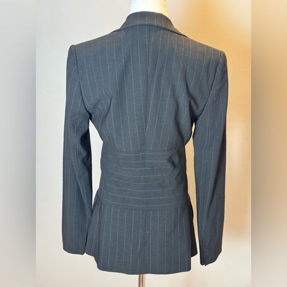Authentic Dolce & Gabbana women's blazer in a classic dark gray pinstripe, featuring a tailored silhouette and waist-cinching belt for a flattering, structured fit. Crafted in Italy from 99% virgin wool, this designer piece blends timeless elegance with modern power dressing-perfect for workwear, fashion-forward layering, or elevated street style.