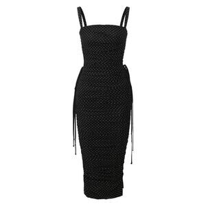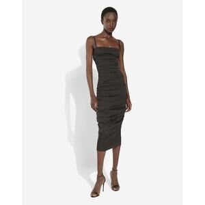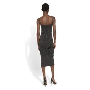 This black dress from Dolce & Gabbana is inspired by Hollywood glamour. It is made from black stretch silk to a ruched silhouette and embellished with a micro polka dot print for a subtly dramatic look.