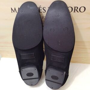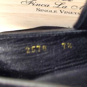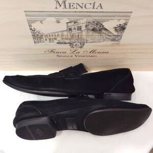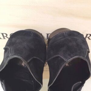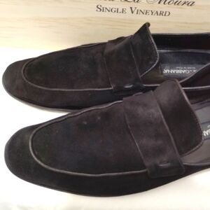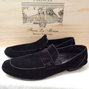 Pre-owned, black suede loafers used primarily indoors. Soles show light wear; moderate wear to uppers. No separations or holes; some areas of discoloration consistent with used condition. Please see pictures for further details. Could use a good suede brush.