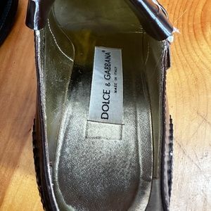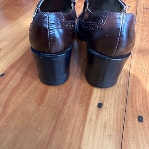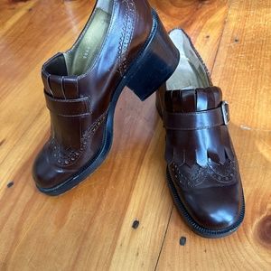 Bought these used for a family member but she never wore them. They were meant to go with a plaid, pleated mini-skirt and tights, but it snowed that day so she wore a boot instead. Super cute, well constructed statement shoe that can crossover from work to casual. Deep rich brown with a lot of "wing tip" style detailing - really unique. Great height heel that offers exceptional stability. Insole and upper in excellent condition. Some wear on bottom sole, but still a lot of life left in the shoe.