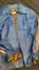 Stylish blue leather jacket by Dolce & Gabbana. Features bold red and white striped sleeves. Perfect for a chic look.
