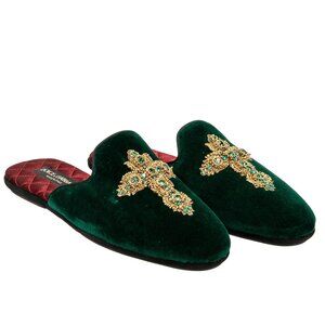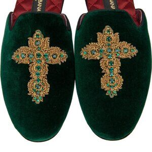 Velvet slipper shoes BRAMANTE with emerald color crystal gold cross in green by Dolce&Gabbana
